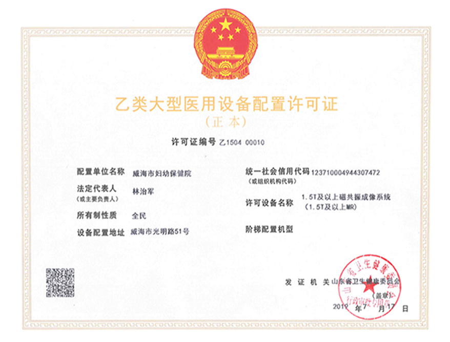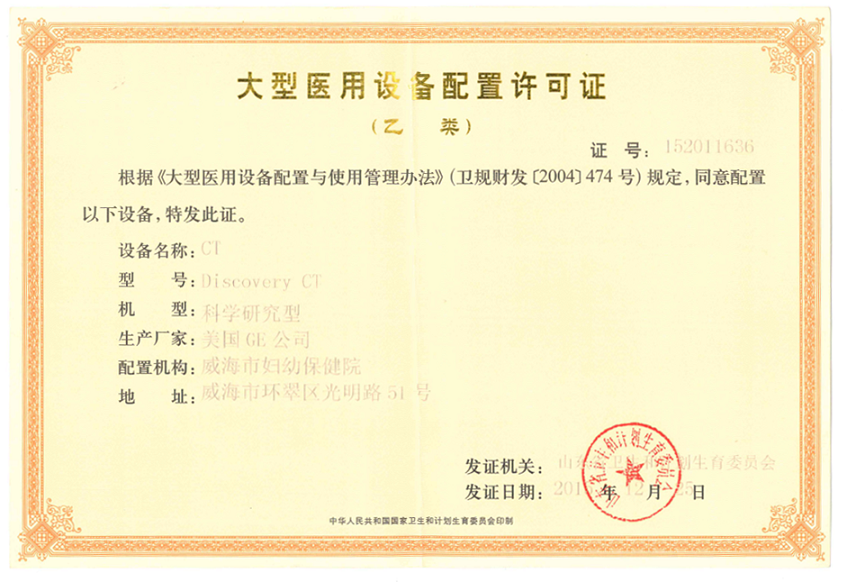 医院编制床位数720张,目前配置大型医用乙类设备两台,分别为:GE超高端宝石能谱CT、飞利浦Ingenia1.5T磁共振,配置许可证如下: